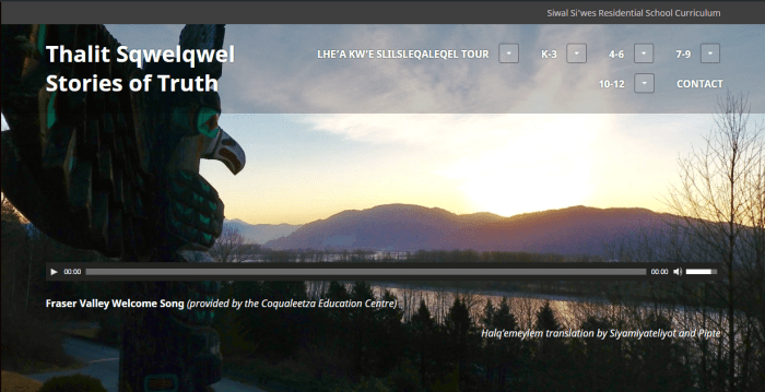 This website entitled, “Stories of Truth”, is the result of a 2 year process of consultation and commitment by the groups mentioned above. The website holds several powerful locally developed video, audio and print resources produced by Siwal Si’wes and Bear Image Productions, and can be found at https://greatspirithand.com