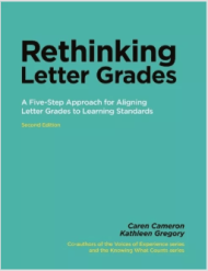 “Teachers in most schools are required to provide letter grades—even if they are philosophically opposed to the practice. In Rethinking Letter Grades, the authors offer a practical five-step process for arriving at letter grades that moves away from collecting a string of marks and calculating a grade. They examine a wide variety of assessment tools (rating scales, scoring keys, rubrics, test scores, observation records, discussion notes, symbols, portfolio collections, and more) and match the student evidence with a description of achievement. This description presents a valid picture of student achievement—one that recognizes all aspects of student performance.” (Source: Portage and Main Press)