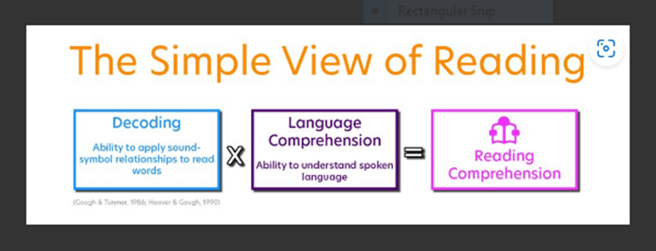 The simple view of reading (Hoover & Gough, 1990) is a theoretical understanding of comprehension as a product of being able to decode words and having the language comprehension needed to comprehend text. If students are weak in either or both of their decoding skills and their ability to understand language, this results in poor reading comprehension. This model addresses the importance of teaching foundational skills in reading, such as phonics, but also providing the opportunities for oral language, background knowledge, vocabulary, language structure, literacy knowledge and verbal reasoning that is part of language comprehension.