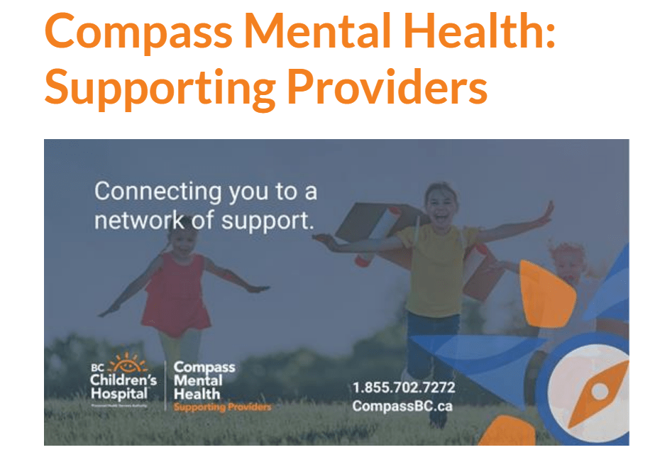 Compass is a province-wide service that supports evidence based care to all BC children and youth (0-25) living with mental health and substance use concerns. This is done by supporting community care providers with the information, advice and resources they need to deliver appropriate and timely care to children and youth close to home.”