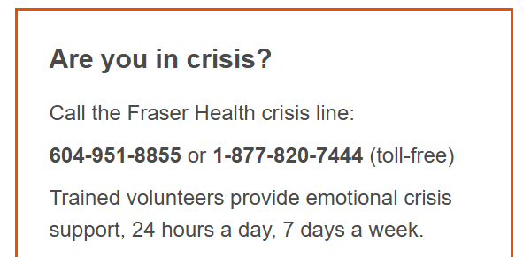 Options Community Services: Free 24/7, 7 days a week, Health Crisis Line (all ages). The crisis line can help with concerns, worry, distress, mental health issues, addiction issues, family violence, abuse, loss and so on. The crisis line provides immediate and confidential emotional support, crisis intervention and community resource information to people of all ages.